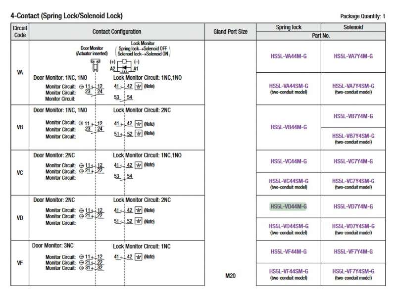 HS5L Miniature Locking, Interlck 4Cnt RearUnlk SprgLck, 2NC Door 2NC Lock Monitor circuits; HS5L-VD44LM-G