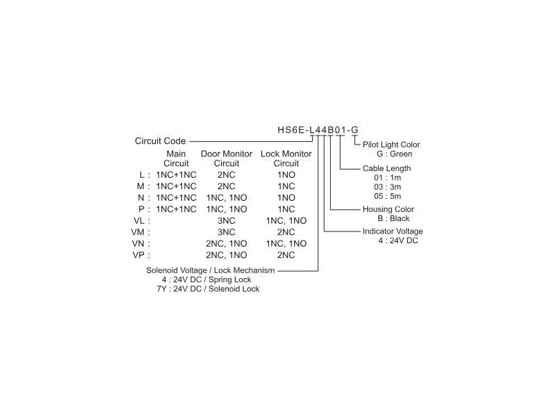 HS6E Subminiature Locking, Safety Switch Solenoid Lock, 1NC+1NC Main 2NC Door 1NO Monitor circuit, 5m cable; HS6E-L7Y4B05-G