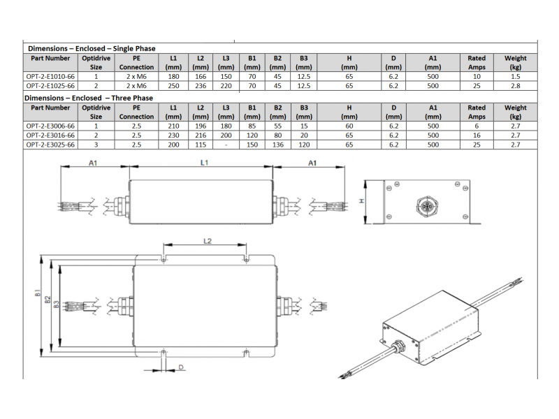 Output filter, 30A, IP20. Compact with Optidrive E3, P2 ,Eco , frame size 3. Reduce the rise time and peak voltage when long motor cables are used to protect the