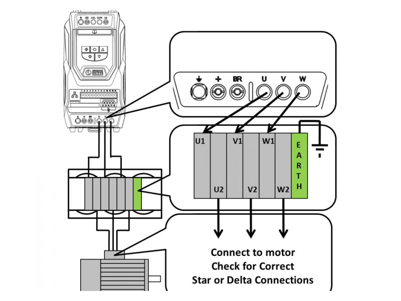 - Reduce the rise time and peak voltage when long motor cables are used to protect the motor