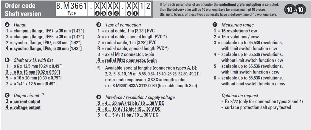 Encoders Absolute multiturn Sendix M3661; 8.M3661.XXXX.XX12 // Resilient Wear-free Magnetic – robust Dimension Ø 36 mm 16 bits multiturn Max 10 mm shaft,...