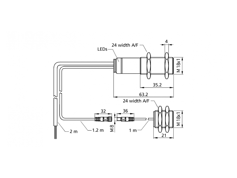 at the receiver: 1.2 m PUR cable, at the transmitter: 1 m PUR cable with M8 initiator plug