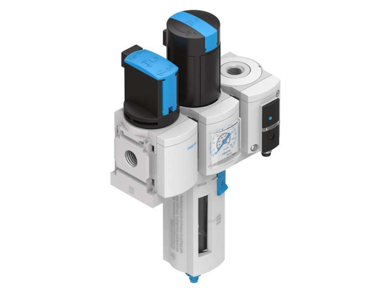 - Combination of filter regulating valve, compressed air filter, air line lubricator, shut-off valve, soft-start valve
