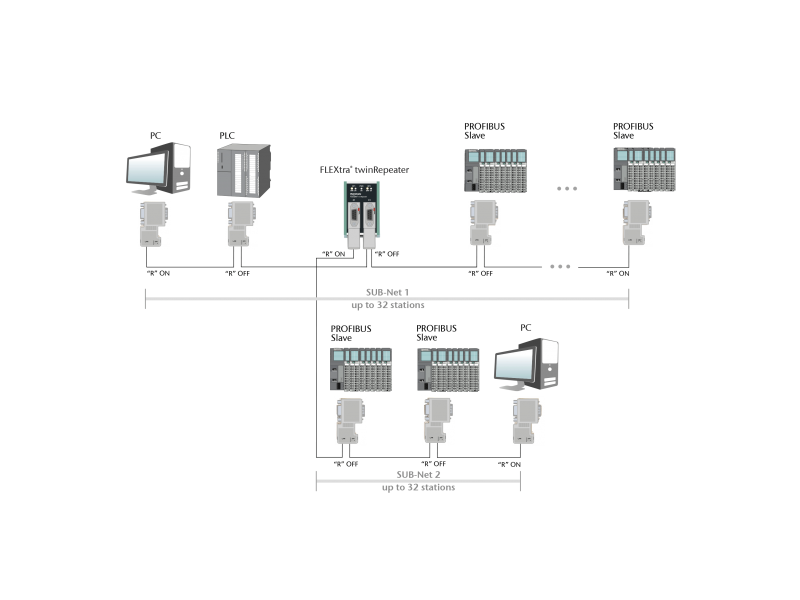 It can be used for bus extension (up to 1 km with 2 FLEXtra® twinRepeaters), to increase the number of participants, and to expand the system. At the same time, use in MPI networks is possible. As a special application option, the FLEXtra® twinRepeater allows the setup of stubs as separate segments.