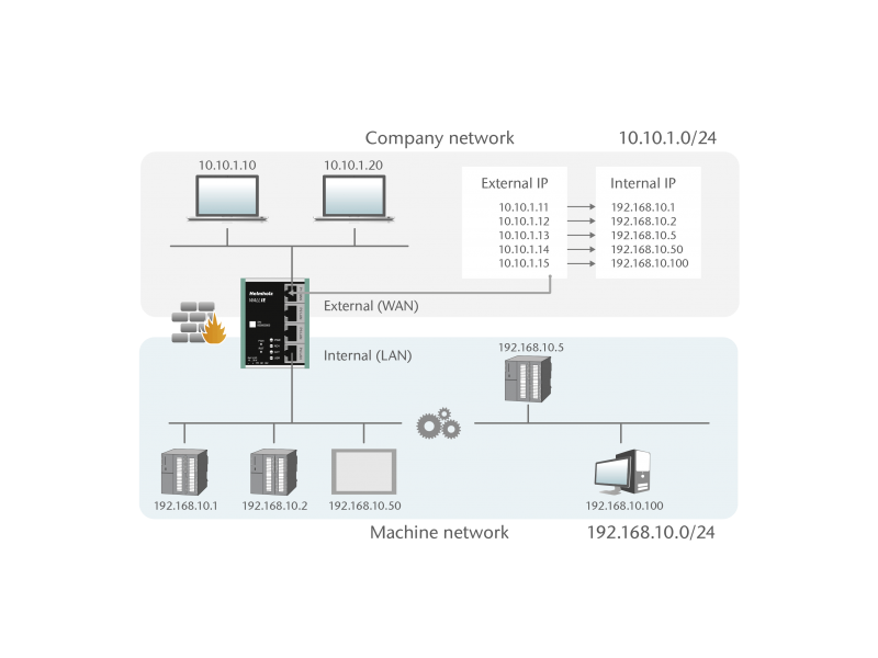 The NAT operating mode serves the forwarding of the data traffic between various IPv4 networks. It enables the address translation via NAT and uses packet filters for the limitation of access to the automation network located behind.