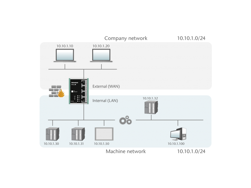 In the bridge operating mode, WALL IE acts as a layer 2 switch. In contrast with normal switches, however, packet filtering is also possible in this operating mode. This means that the restriction of access to individual areas of your network can be achieved without having to use different networks for this purpose.