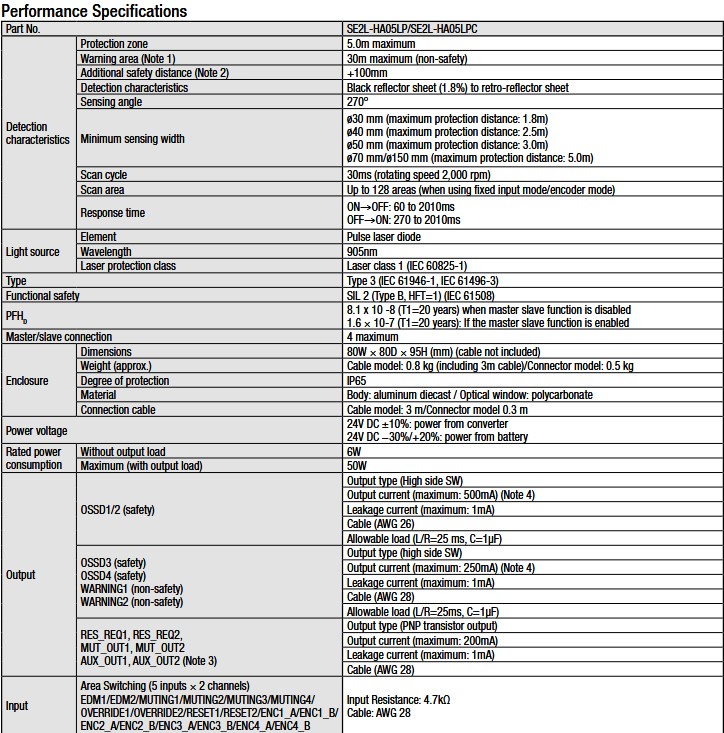 SE2L Advanced Safety Laser Scanner, connector type; SE2L-HA05LPC SE2L-HA05LPC is used with an optional connector cable (SE9Z-HS2-C***). (***: 002 = 2m, 005 = 5m,