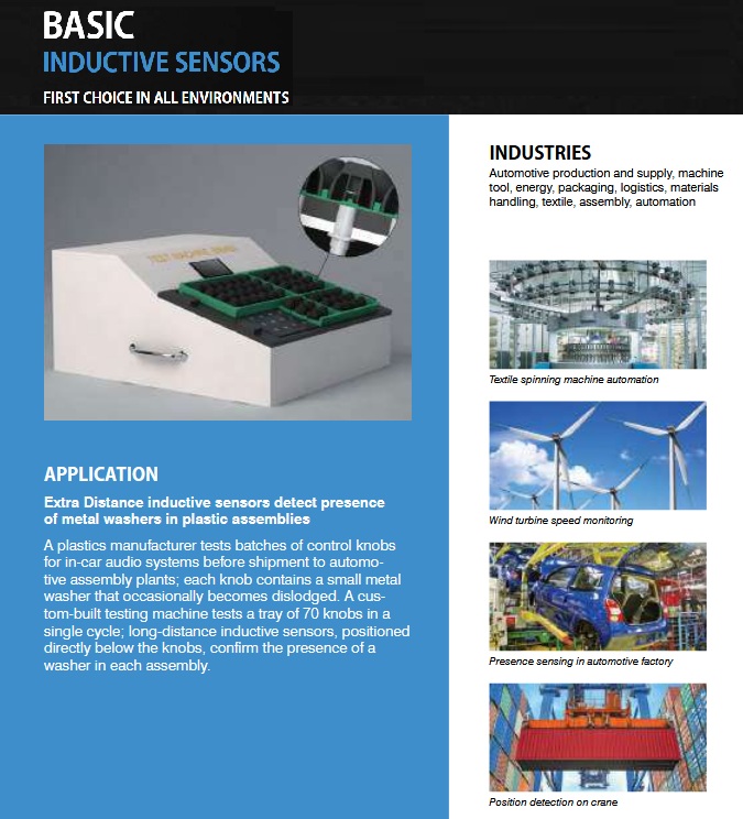 Basic induktivni senzori dostupni su u veličinama počevši od M8 do M30, kao i C44, sa opcionim modelima fi6.5mm i 8mm kvadratnog preseka. Samim tim je ponuda dosta fleksibilna i predstavlja najbolje rešenje za skoro svaku industrijsku aplikaciju.