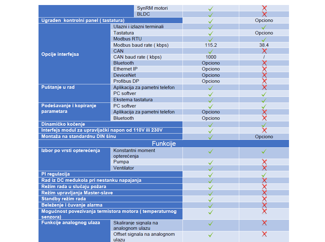 U tabeli dole, upoređene su glavne odlike i specijalne funkcije :